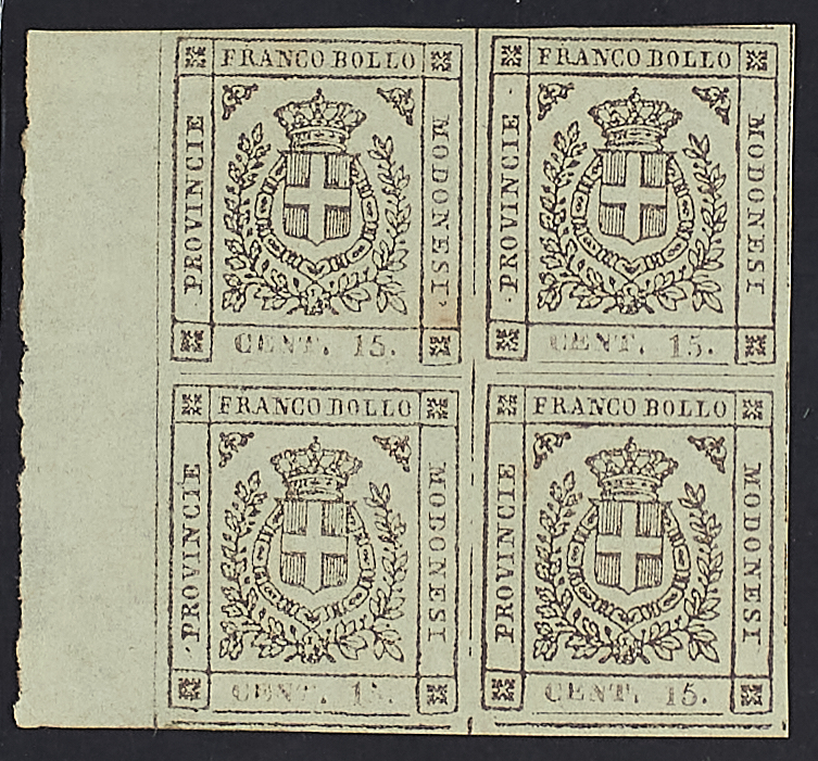 1859 - 15 c. bruno blocco di quattro bordo di foglio a sinistra - Raro - Da esaminare - Cert. Bolaffi