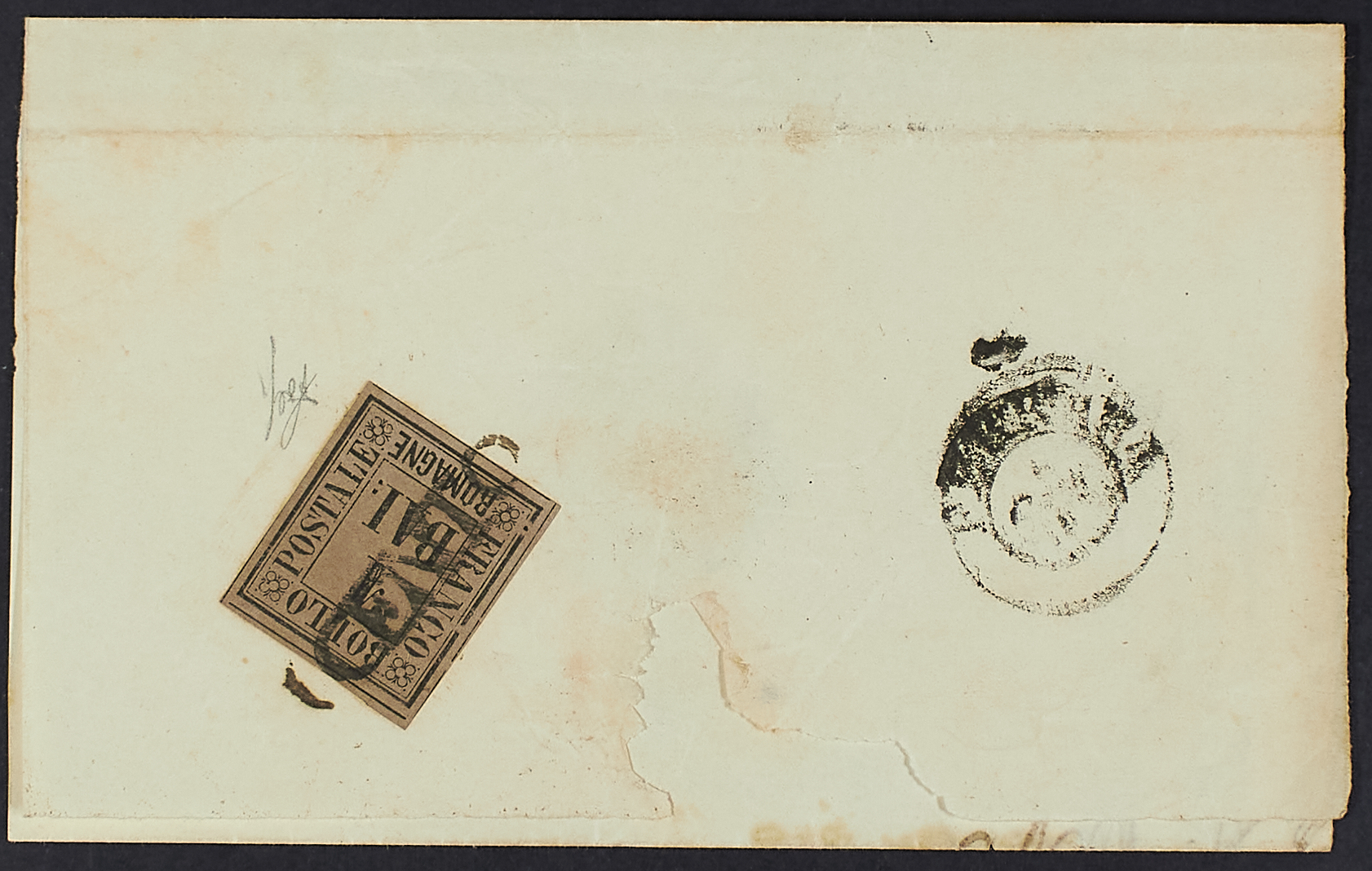 1859 - 1 baj. bruno grigio isolato al verso di involucro di lettera del 6 gennaio 1860 da Cento per Ferrara - Cert. Wolf