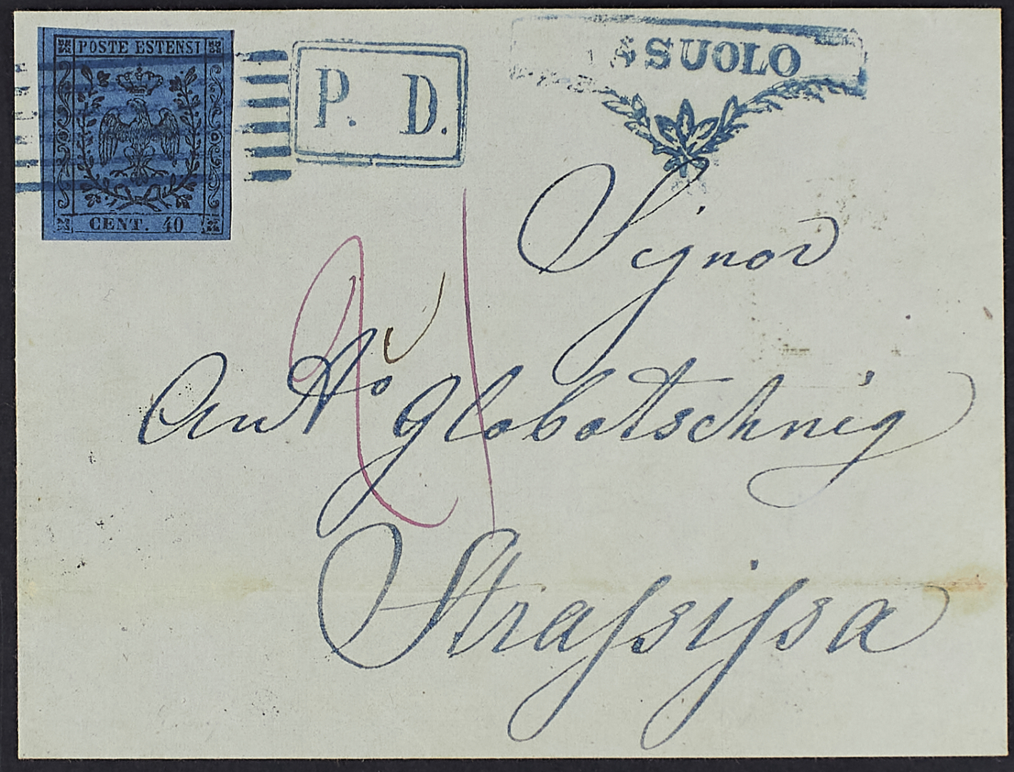 1852 - 40 c. azzurro scuro su lettera del 25 ottobre 1855 da Sassuolo per Strasissa (Illiria) - Destinazione rara