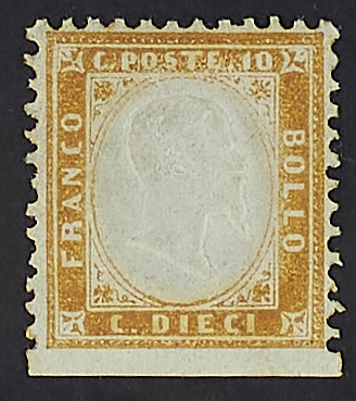1862 - Prima emissione dentellata 10 c. bistro bordo di foglio inferiore - Molto fresco e ben centrato - Cert. Bolaffi