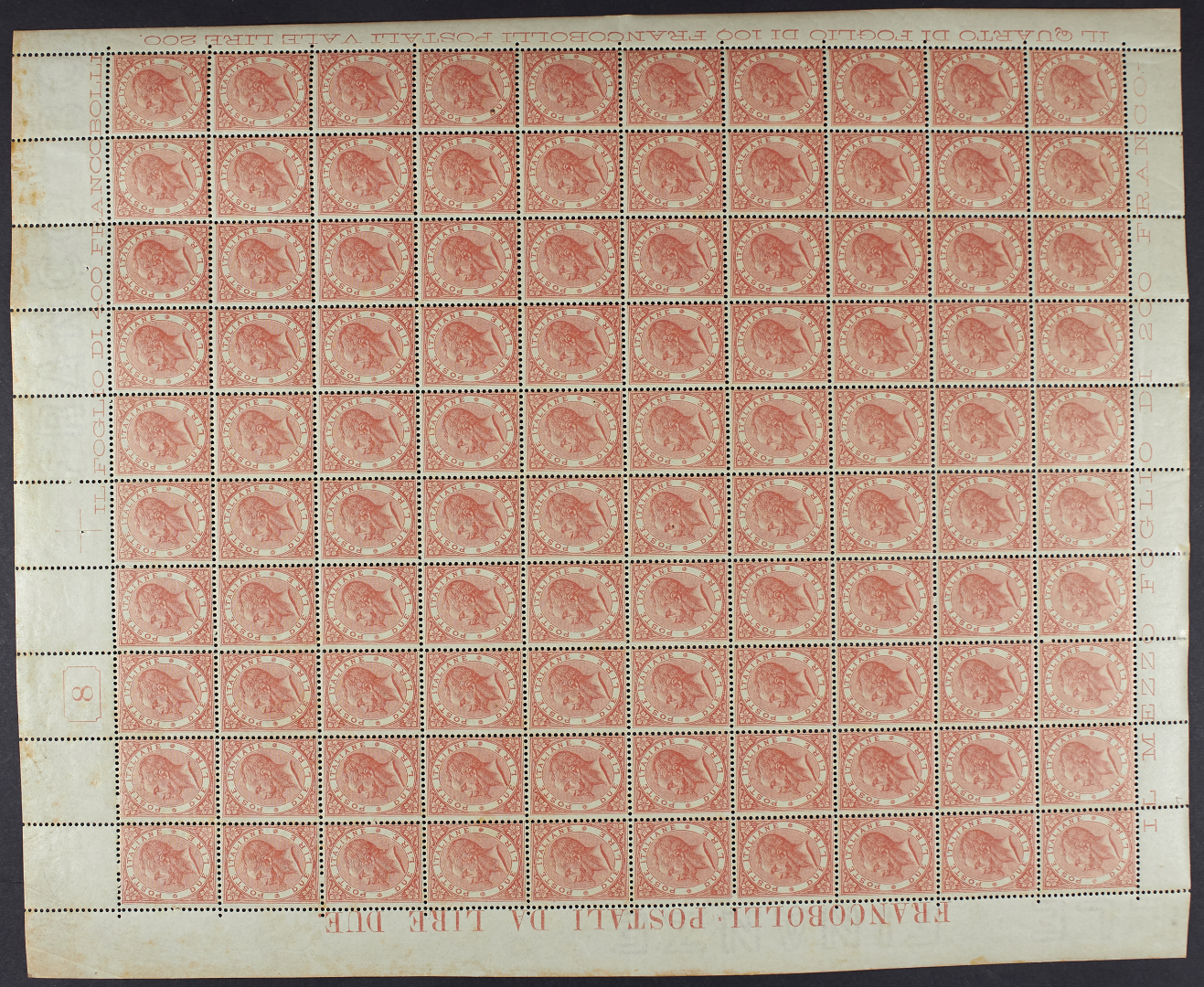 DEFINITIVA 2 L. SCARLATTO VIVO TIRATURA DI TORINO + UMBERTO I EMISSIONE 50 C. VIOLETTO - I DUE FOGLI DI CENTO ESEMPLARI