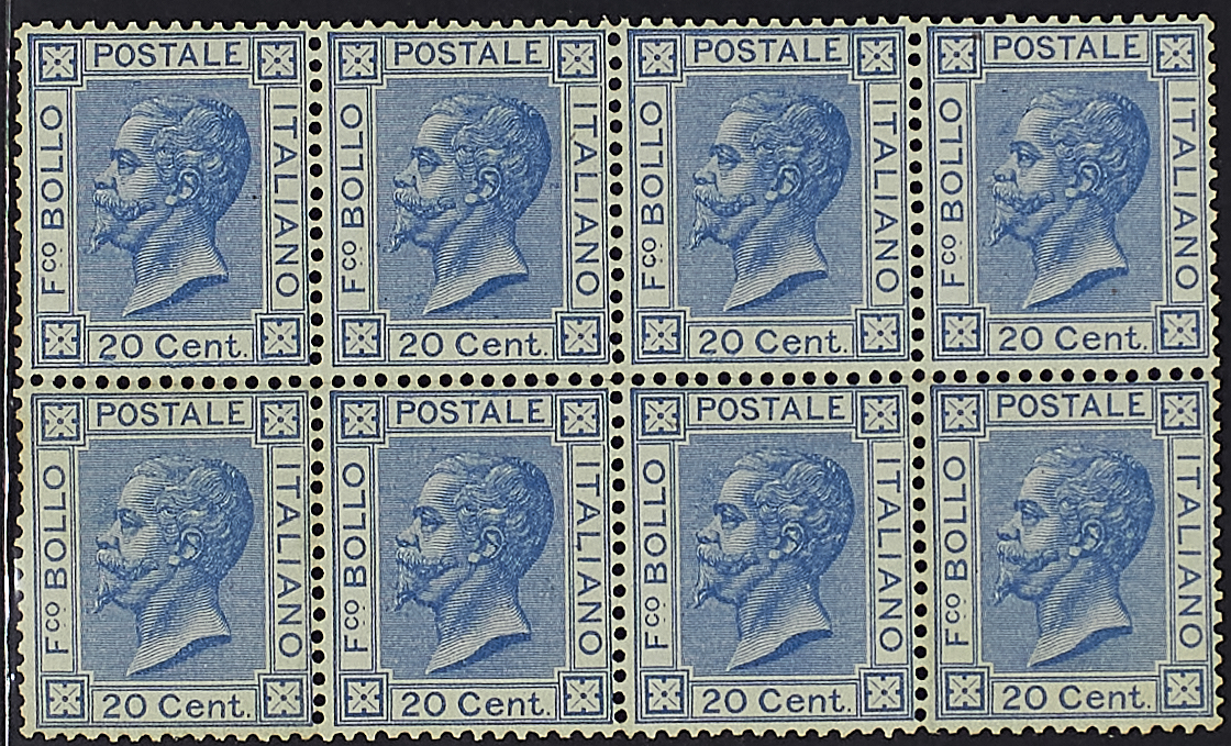 1867 - Nuovo formato 20 c. azzurro blocco orizzontale di otto esemplari e blocco irregolare di sette esemplari - Alcuni piccoli difetti da esaminare ma esemplari di notevole freschezza
