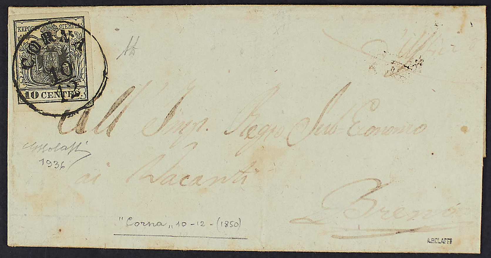 1850 - 10 c. nero isolato su lettera del 10 dicembre da Corna per Breno - Firme G. Bolaffi e A.D.
