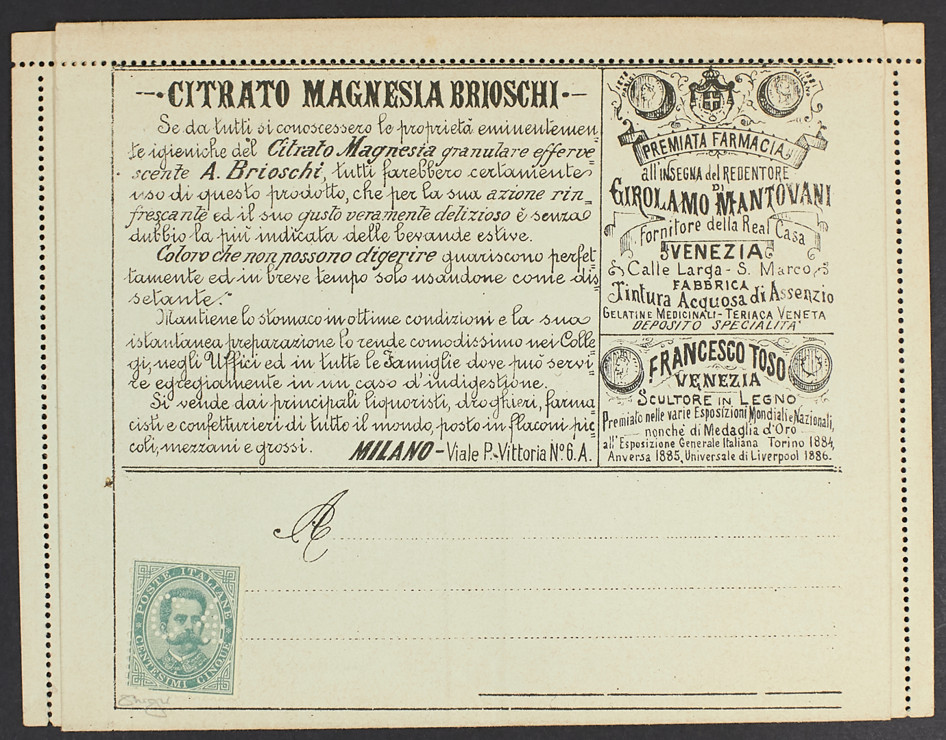1887 - 4 c. / 5 c. su lettera pubblicitarie nuova - Molto fresca - Da esaminare - Cert. Raybaudi