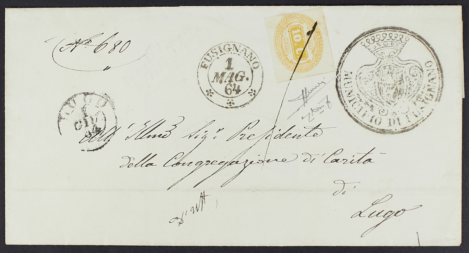1863 - Prima emissione 10 c. ocra annullato a penna su involucro di lettera non affrancata del 1° giugno 1864 (datario errato per maggio) da Fusignano per Lugo - Non comune - Cert. Avanzo - Firma Sorani
