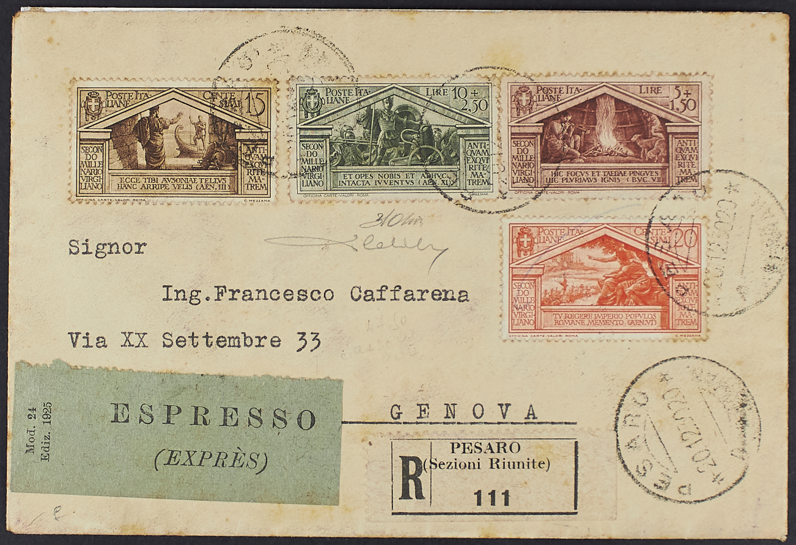 1930 - Virgilio 15 c. + 20 c. + 5 L. su raccomandata espresso del 20 dicembre da Pesaro per Genova - Cert. Cardillo - Firma Savarese
