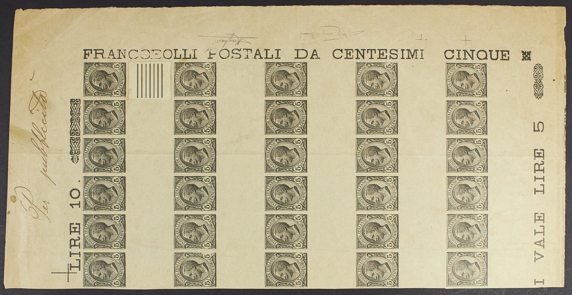 1924 - 5 c. grigio senza appendice pubblicitaria - Prova in blocco di 30 esemplari su carta grigia non dentellata e senza filigrana - Uniti ulteriore esemplare singolo e blocco di quattro - Insieme raro - Cert. Colla, Diena e Raybaudi