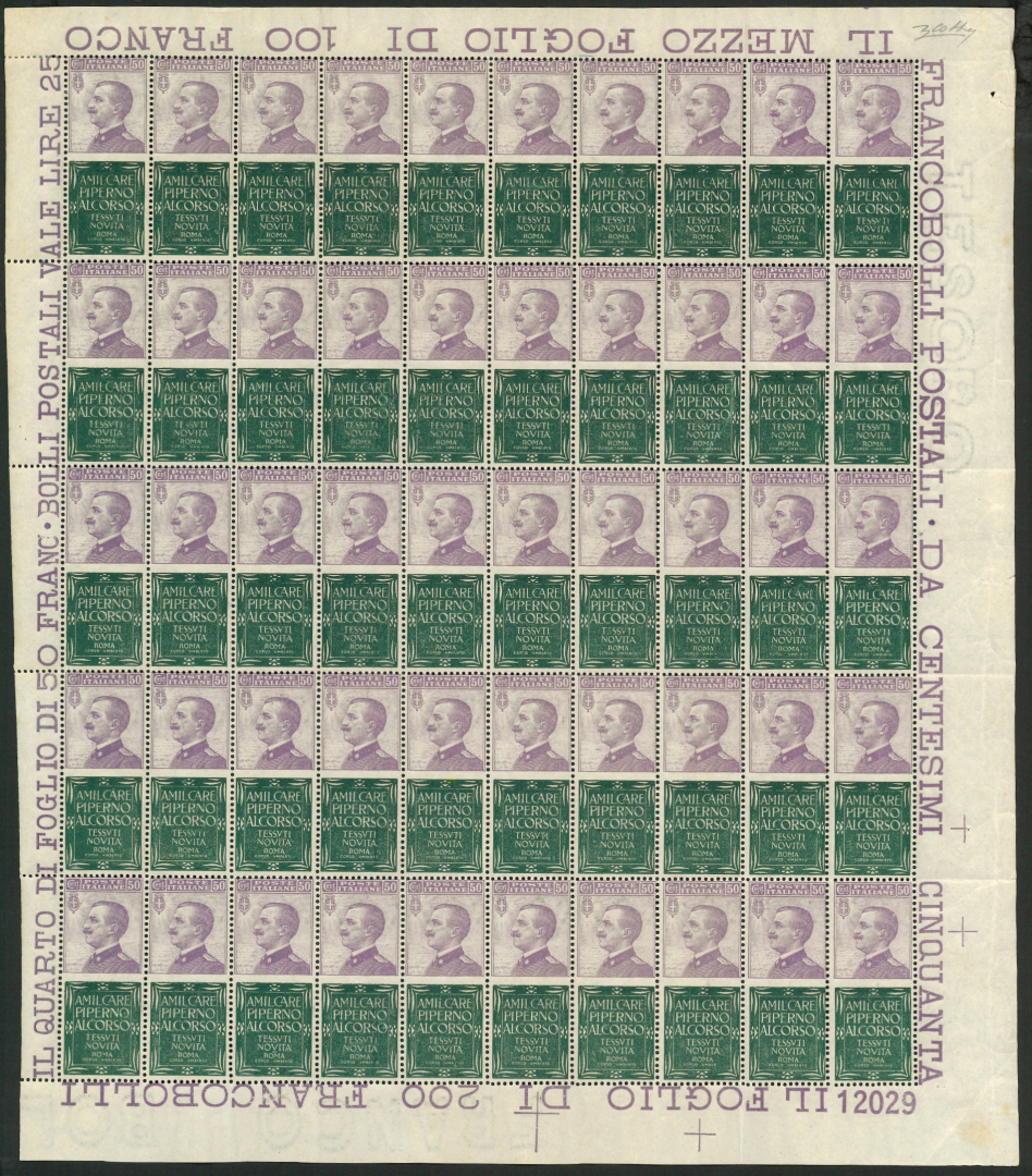 1924 - 50 c. Piperno - Il foglio completo di 50 esemplari - Insieme di notevole freschezza - Unico noto e grande rarità del Regno d'Italia - Cert. Colla