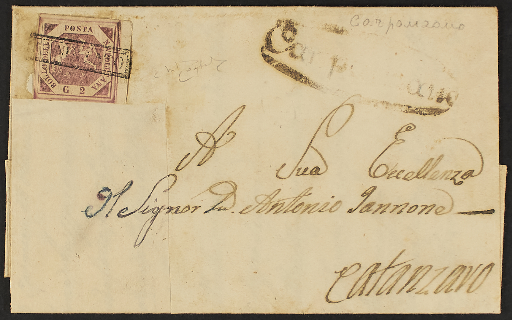 1858 - Carpanzano - Ovale su lettera del 13 gennaio per Catanzaro affrancata con 2 gr. I tavola carminio - Documento parzialmente ricostruito (aggiunta di carta) e francobollo staccato per controllo e ricollocato tramite linguella - Raro - Da esaminare - Cert. Raybaudi