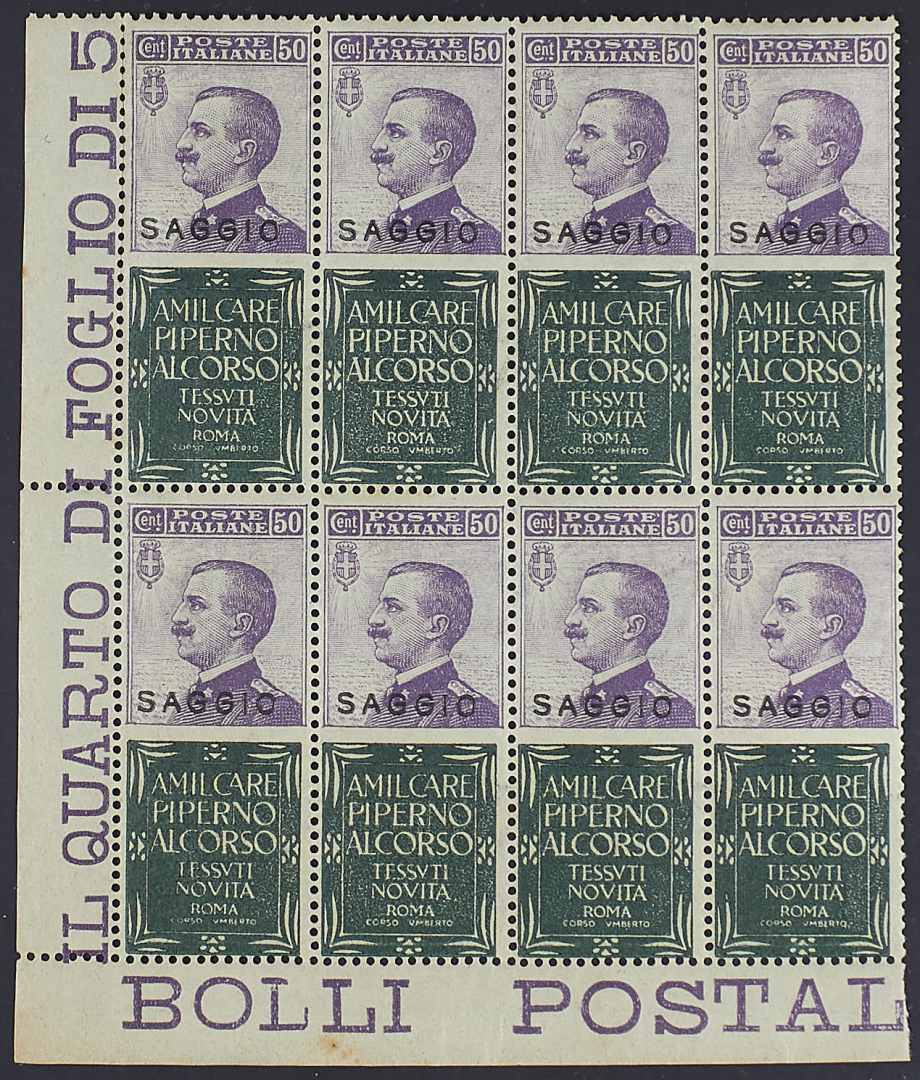50 C. TAGLIACOZZO BLOCCO DI OTTO ESEMPLARI ANGOLO DI FOGLIO INFERIORE DESTRO CON SOPRASTAMPA "SAGGIO"