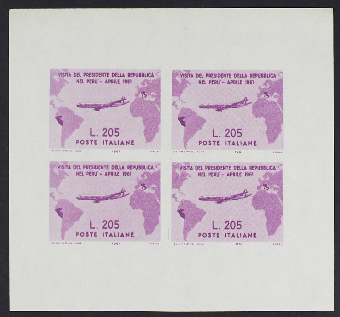 1975 - Gronchi rosa 205 L. - La riproduzione ufficiale in foglietto non dentellato e non gommato di quattro esemplari omaggiata ai partecipanti alla riunione sulla filatelia svoltasi a Roma il 28 novembre 1975 - Raro - Cert. Raybaudi