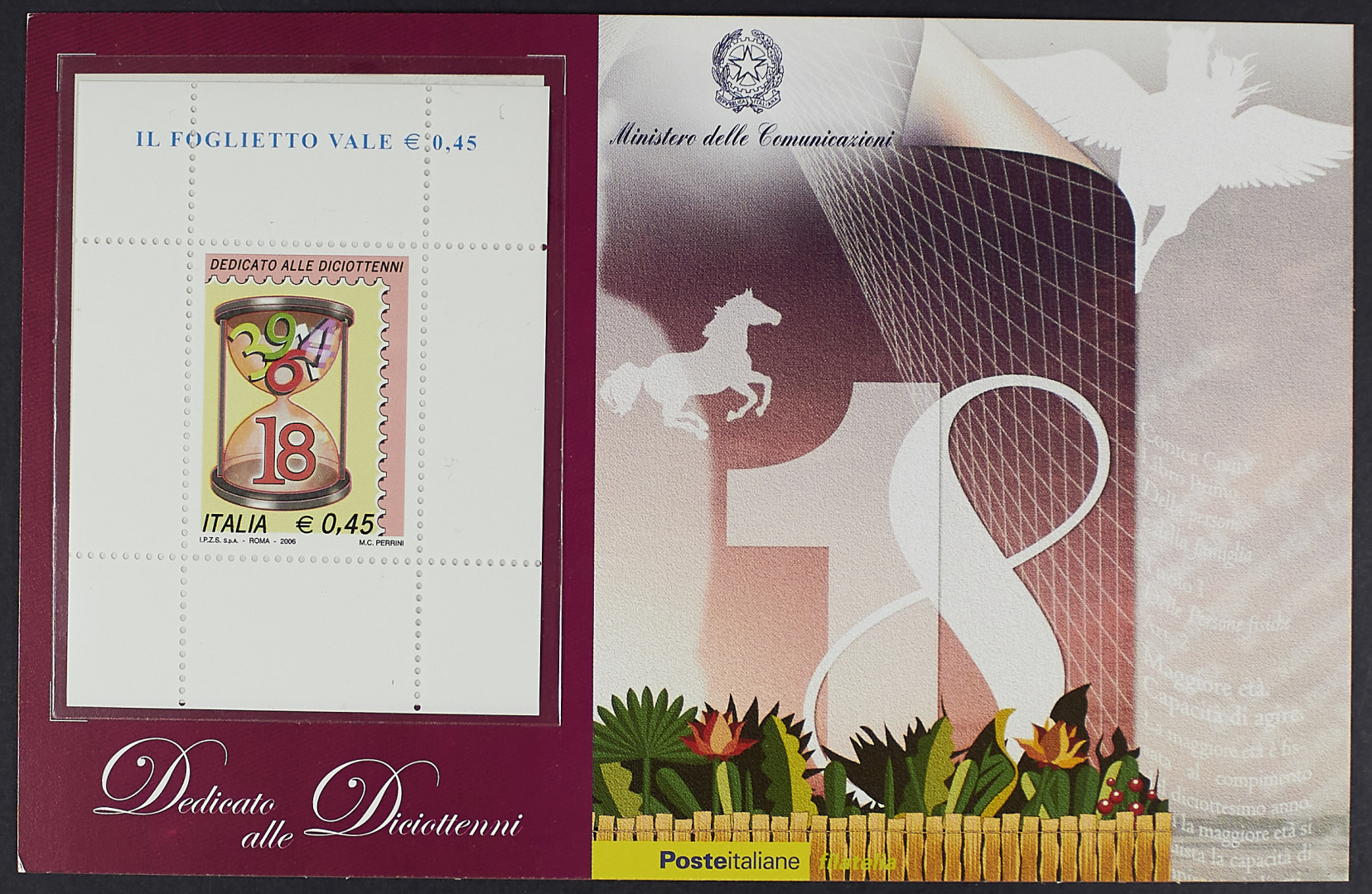 2006 - Diciottenni - I foglietti rosa e azzurro nei cartoncini ufficiali delle Poste Italiane con la lettera del ministro Gentiloni