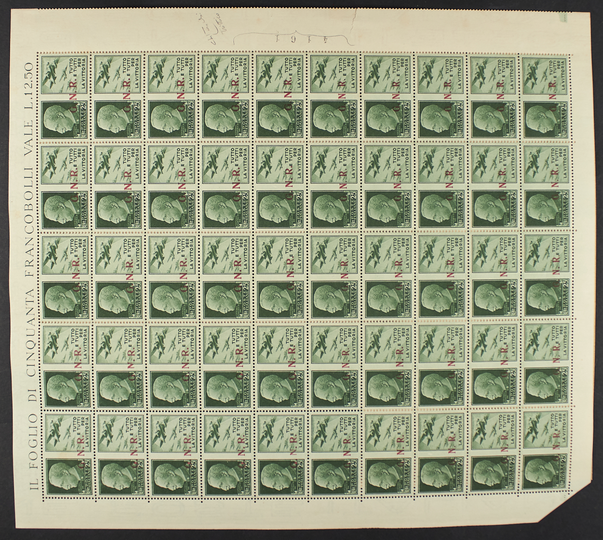 1943 - 25 c. (III) + 25 C. (IV) - Doppio foglio di 50 + 50 esemplari (sei mancanti) divisi da interspazio con le metà superiori soprastampe II tipo e le metà inferiori soprastampe III tipo contenenti otto coppie verticali "GN" II + III tipo a un "trittico" con varietà "GN" II tipo e "R" III tipo - Insieme raro anche per la presenza di coppie orizzontali con interspazio - Cert. Raybaudi