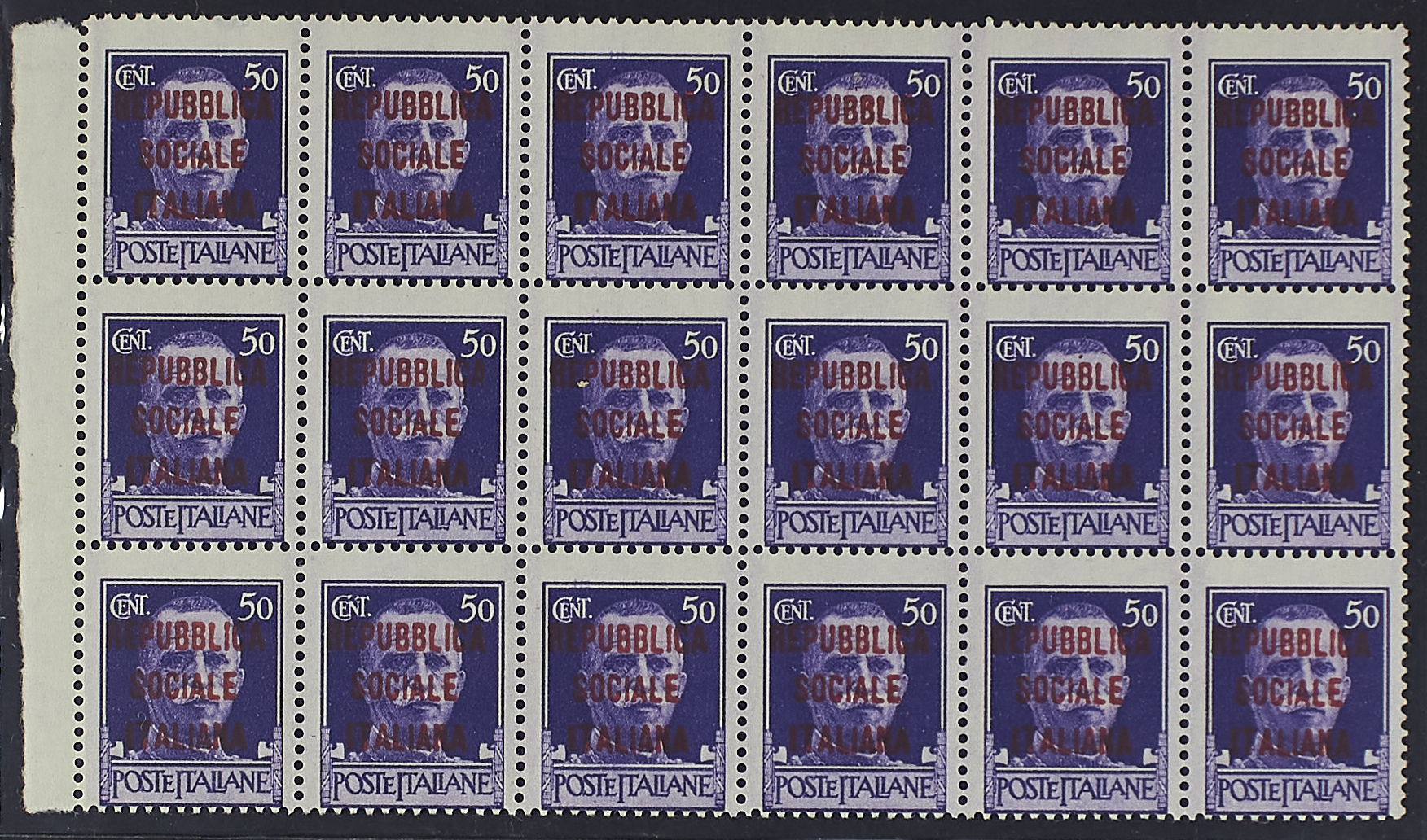 IMPERIALE 50 C. TIRATURA DI MILANO BLOCCO ORIZZONTALE DI DICIOTTO ESEMPLARI BORDO DI FOGLIO A SINISTRA