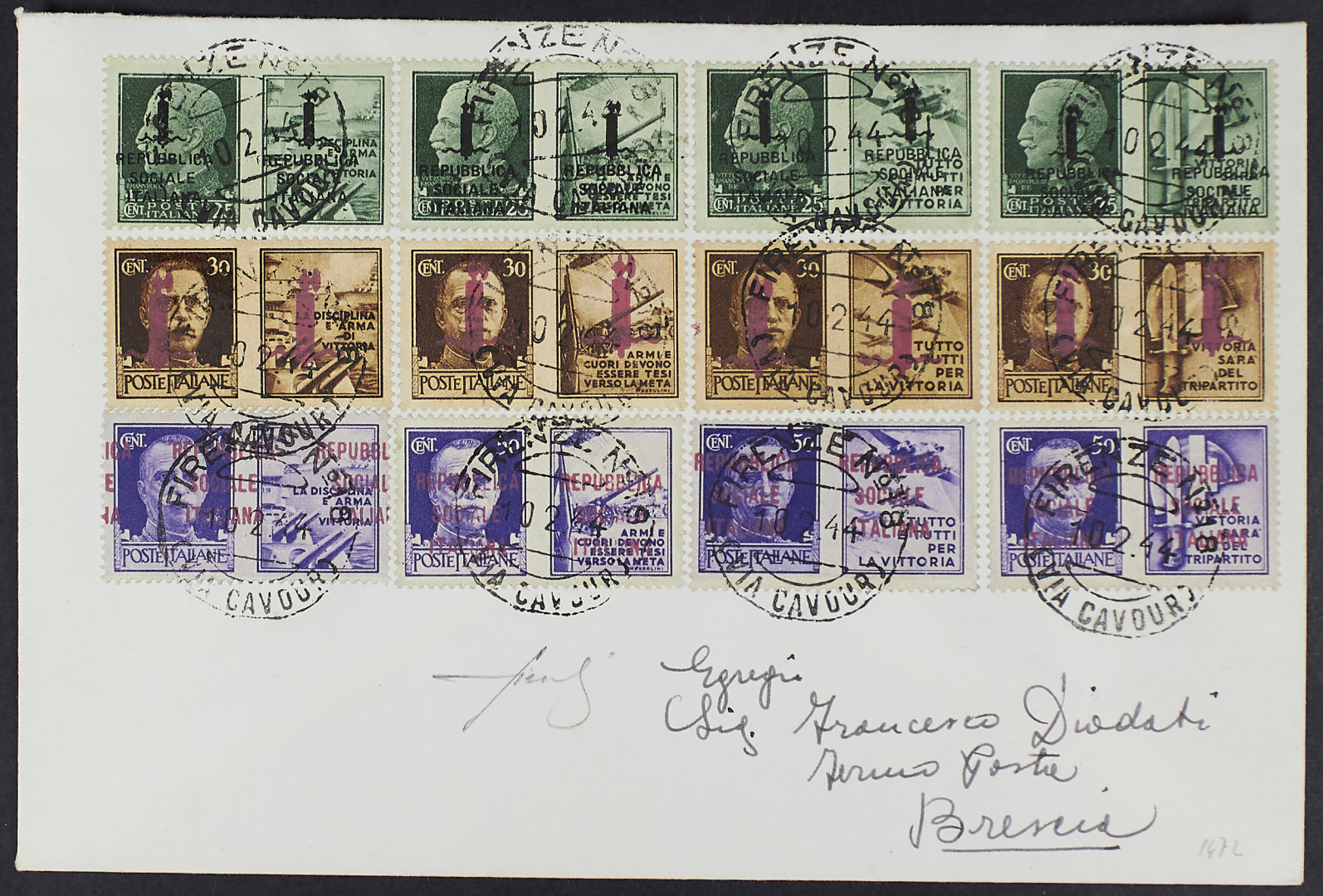 1944 - Tiratura di Firenze - La serie su busta del 10 febbraio da Brescia per città - Documento filatelico ma non comune - Cert. Fiecchi