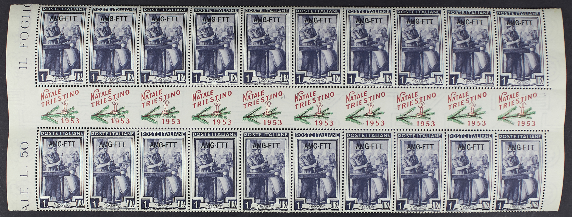 1953 - Natale Triestino - Italia al lavoro 1 L. + 2 L. + 5 L: tre blocchi di venti esemplari con interspazio orizzontale