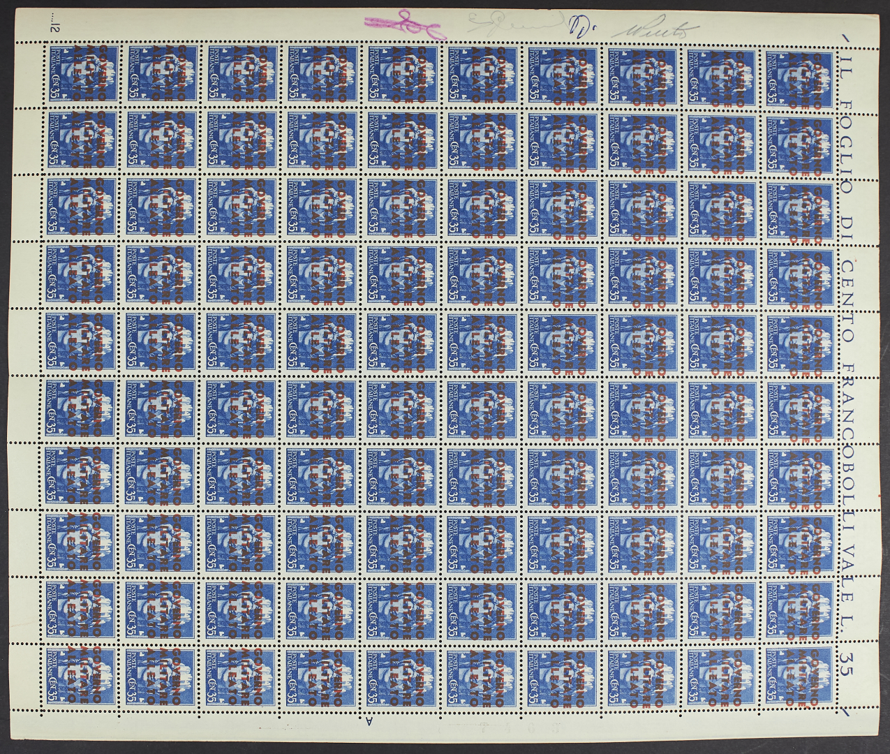 1943 - Napoli Occupazione Alleata - L'emissione in fogli da cento esemplari - 20 c. senza bordo sinistro e 35 c. con scritte a matita e penna sul medesimo bordo