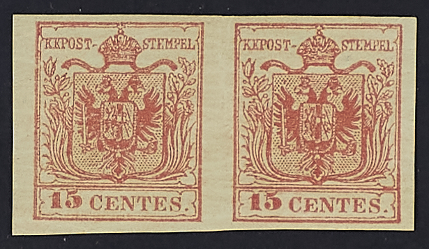 1854 - 15 c. rosso vermiglio III tipo coppia orizzontale - Unita II emissione 10 s. bruno I tipo due esemplari con numerosi difetti - Firme Giulio Bolaffi e A.D.