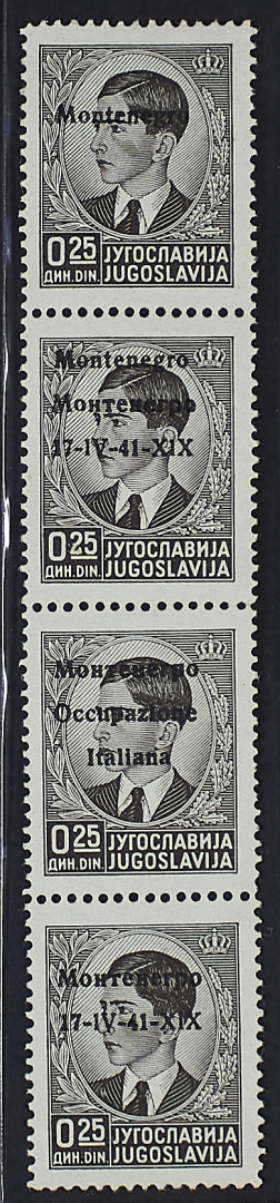 1941 - Prima emissione - Saggi - Tre strisce verticali di quattro esemplari dei valori da 0,50 d., 1 d. e 1,5 d. con soprastampe di prova comprendenti varietà di composizione tipografica - Insieme non comune - Cert. Cardillo - Firma Raybaudi