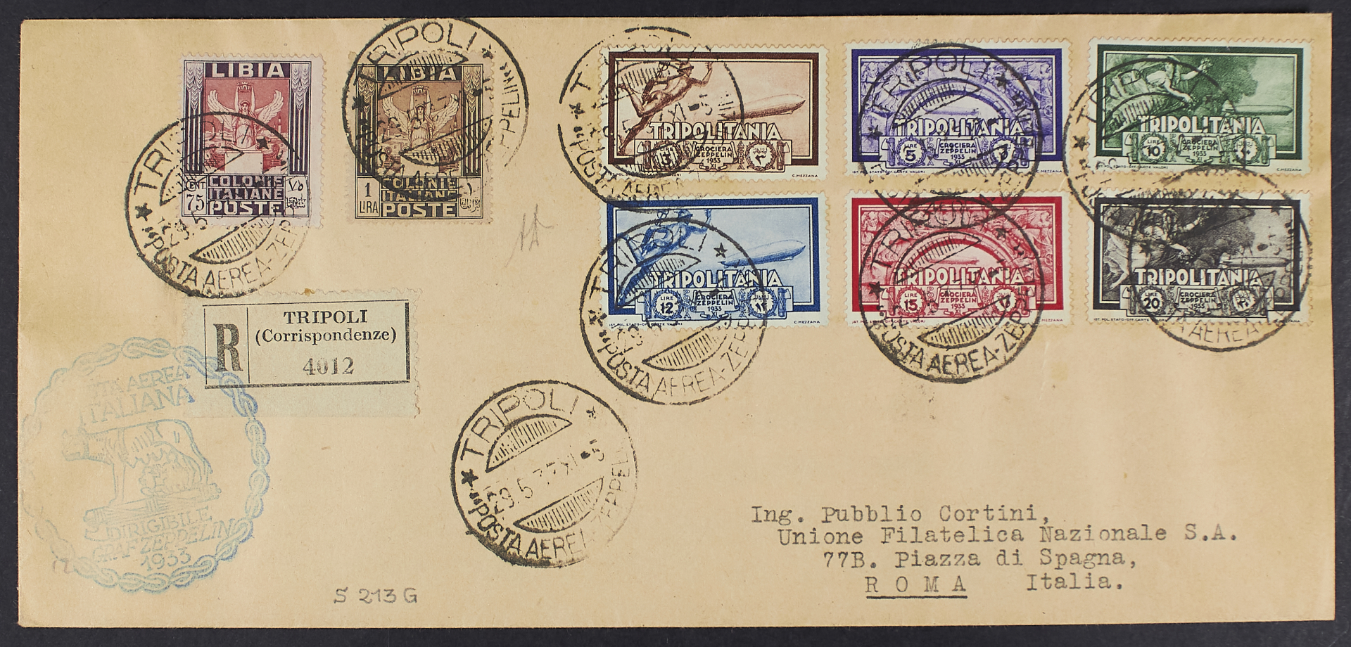 1933 - Zeppelin - La serie con valori complementari su raccomandata aerea del 29 maggio da Tripoli per Roma - Firma A.D.