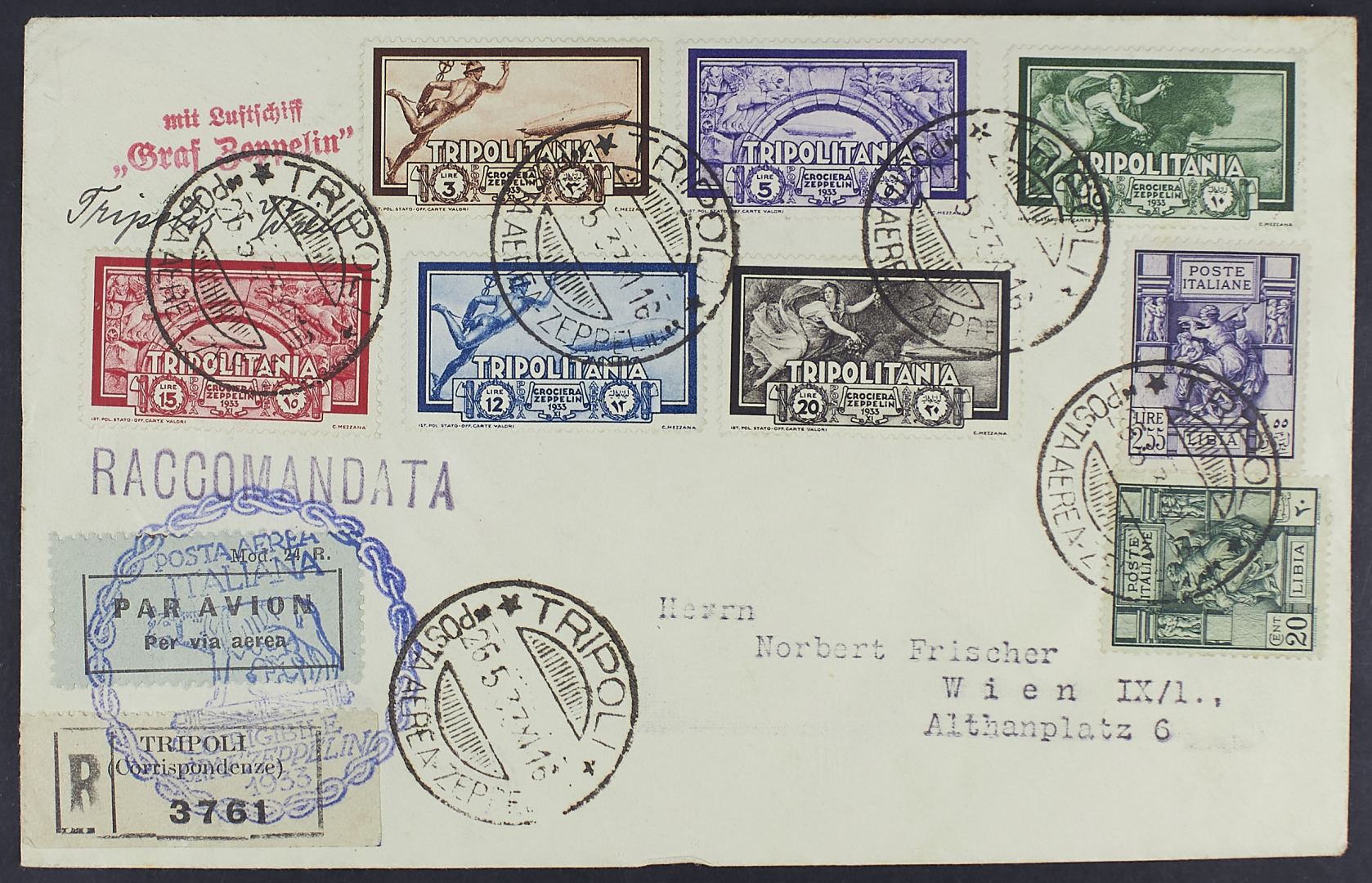 1933 - Zeppelin - La serie con valori complementari su raccomandata aerea del 26 maggio da Tripoli per Vienna - Molto bella