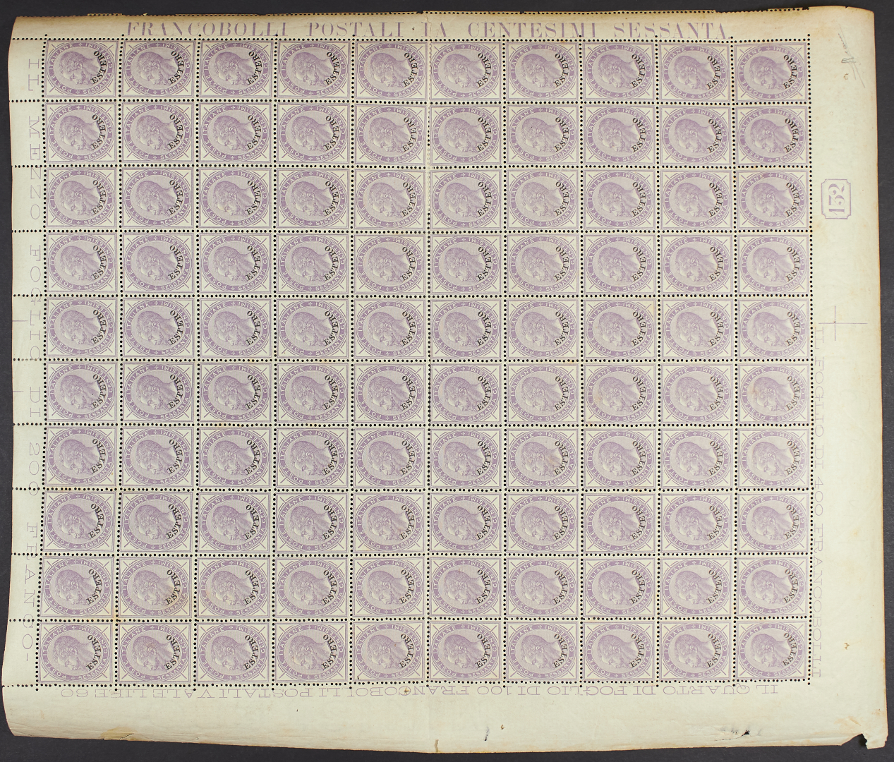 1874/1900 - Pima emissione 30 c. bruno + 40 c. rosa + 60 c. lilla in fogli da cento esemplari - Unito il foglio da cento de La Canea I emissione 1 pi. / 25 c. - Dentellatura "aperta" in più punti - Da esaminare - Firma Sorani