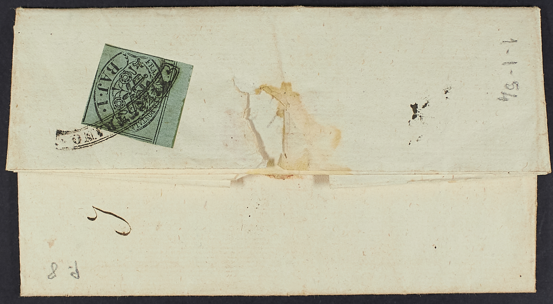 1854 - Filottrano - Cartella annullatrice di I emissione 1 baj. al verso di lettera del 1° gennaio 1854 per Macerata