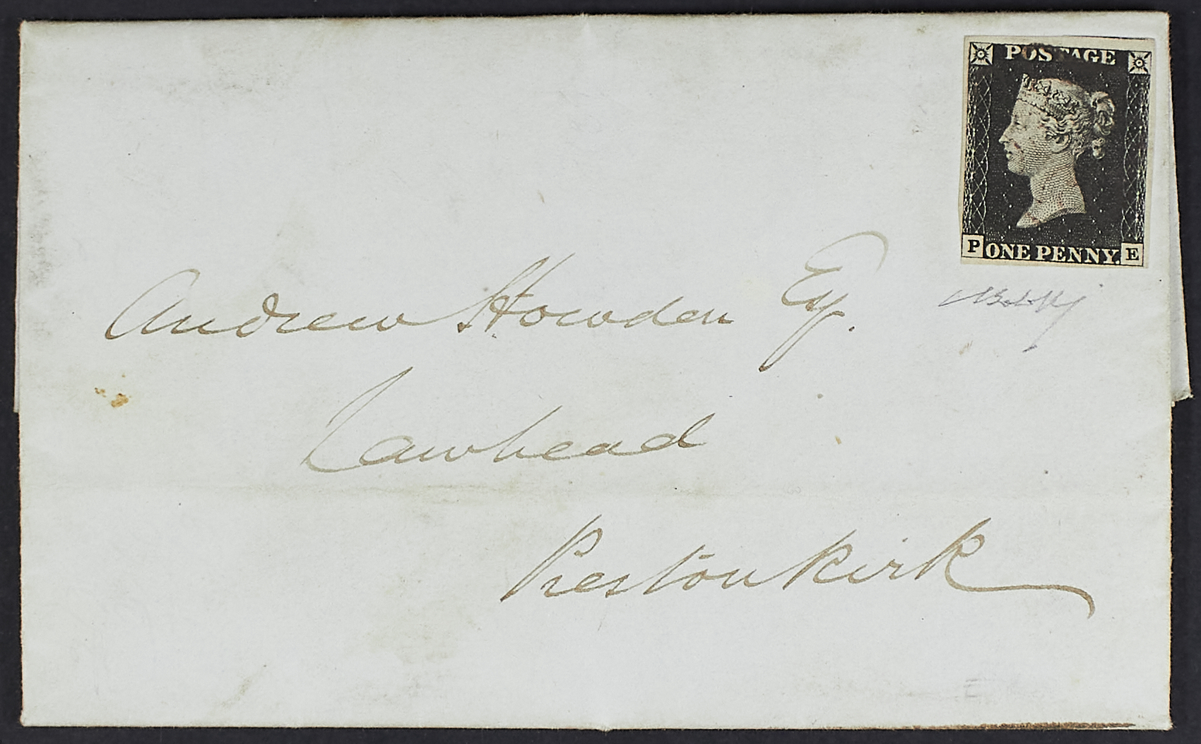 1840 - Prima emissione 1 p. nero su lettera del 28 novembre da Hardington per Prestonkirk - Firma A.G. Bolaffi