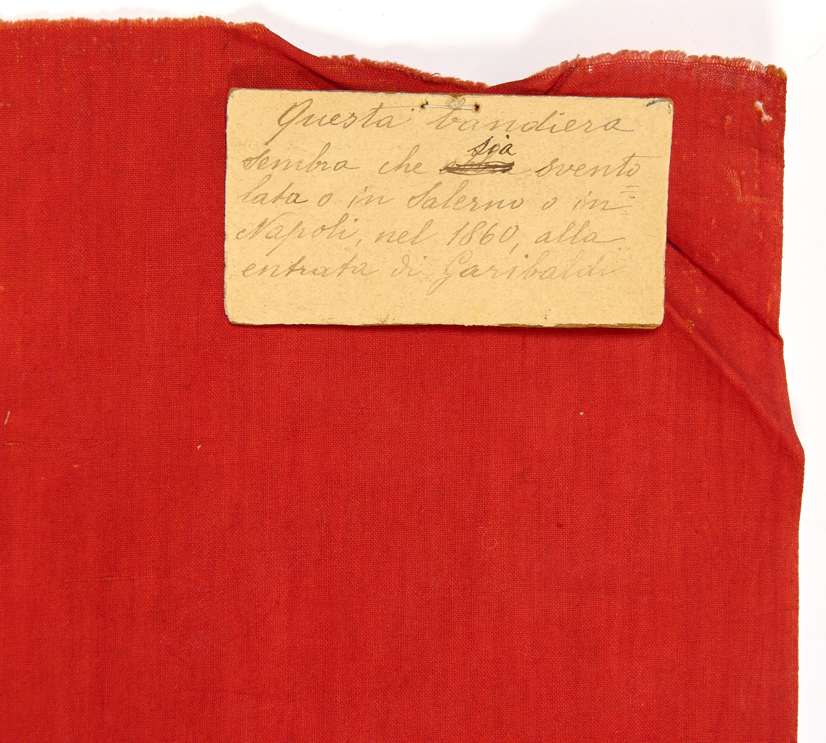 cotton. A handwritten note, presumably contemporary, is affixed to the top edge, bearing the following inscription: “This flag appears to have flown either in Salerno or Naples, in 1860, at Garibaldi's entry.”