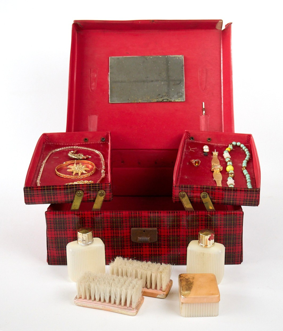 Equipped with accordion-style compartments and a small mirror inside the lid. Contains various plastic toiletries and vintage costume jewelry.