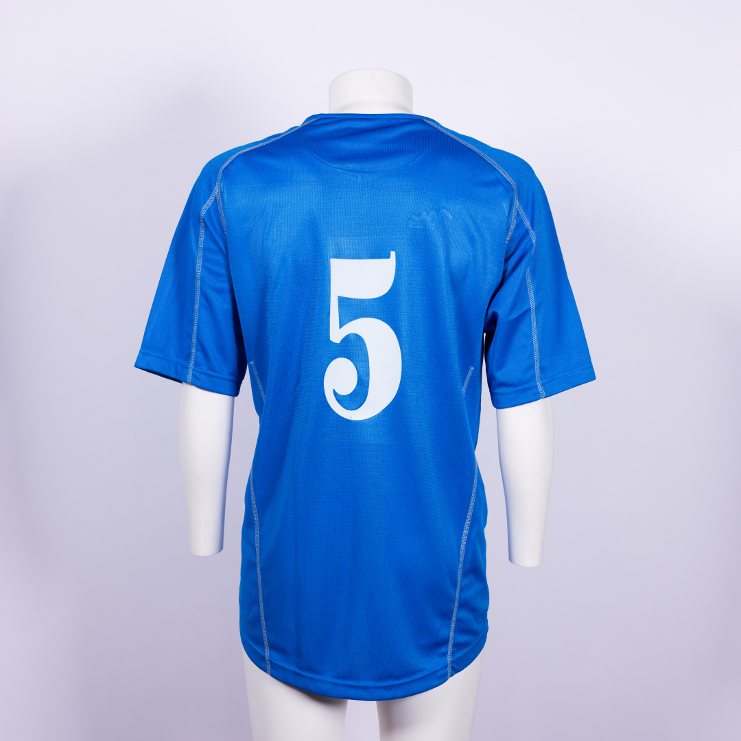 On the front: commercial sponsor and club crest applied, technical sponsor embroidered.
