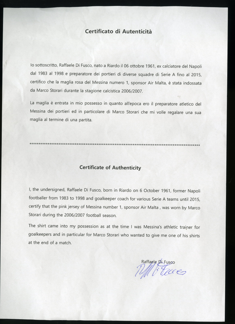 Jersey worn by Storari in a pre-season friendly and donated to his trainer Raffaele Di Fusco.
