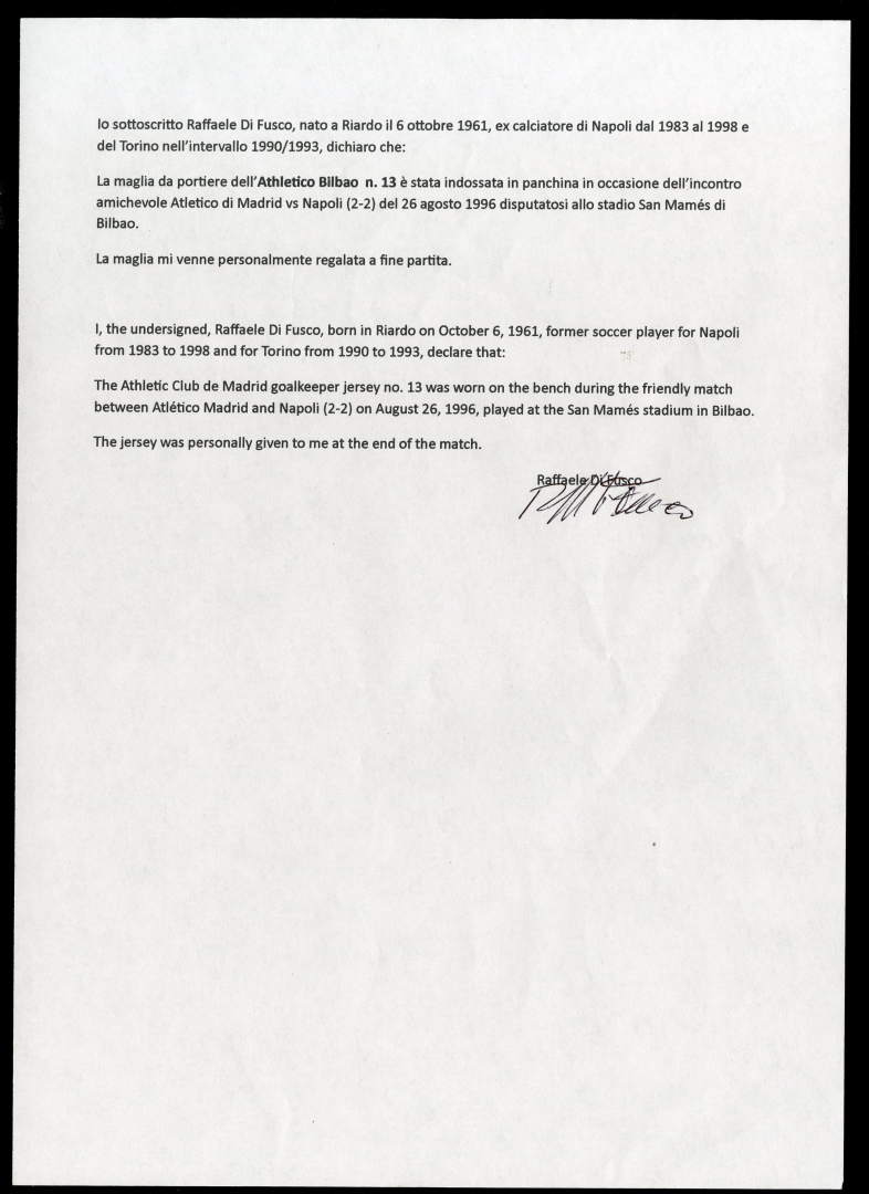 Jersey worn by Etxeberria during the friendly match between Athletic Bilbao and Napoli (2-2) on August 22, 1996, and donated to his opponent, Raffaele Di Fusco at the end of the match.