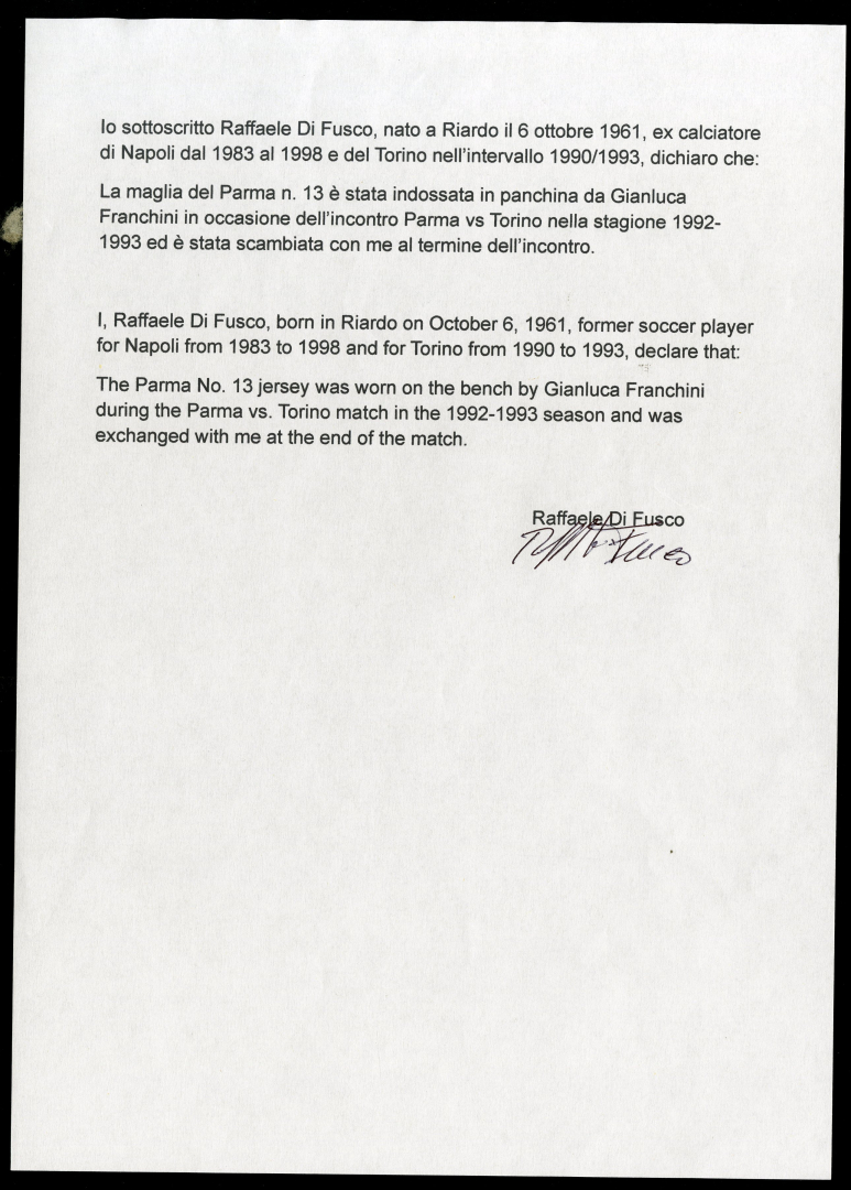 Jersey worn by Matrecano during the Parma vs. Napoli match (1-1) on January 24, 1993, and donated at the end of the match to his opponent Raffaele Di Fusco.