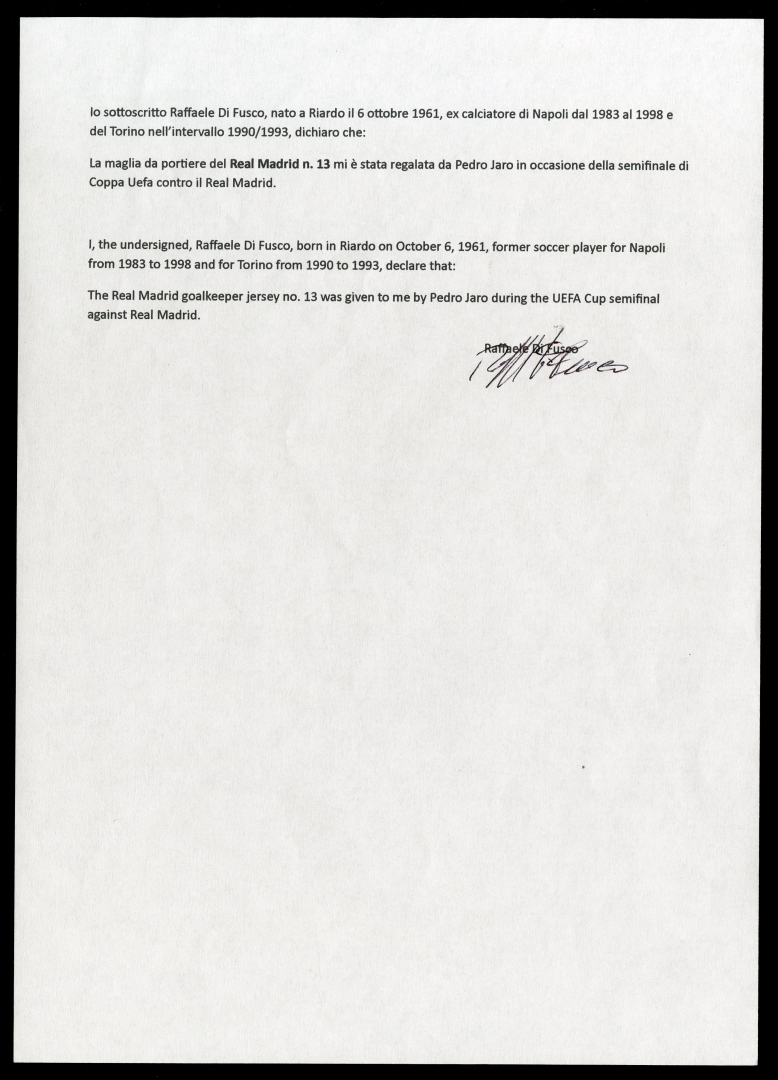 The jersey was given by Jaro to his opponent Di Fusco during the UEFA Cup semifinal against Real Madrid in 1992, even though it was not worn on that occasion.