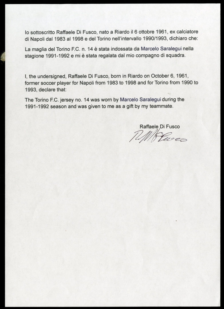 Jersey worn by Saralegui in the 1992-1993 season and donated to teammate Raffaele Di Fusco.