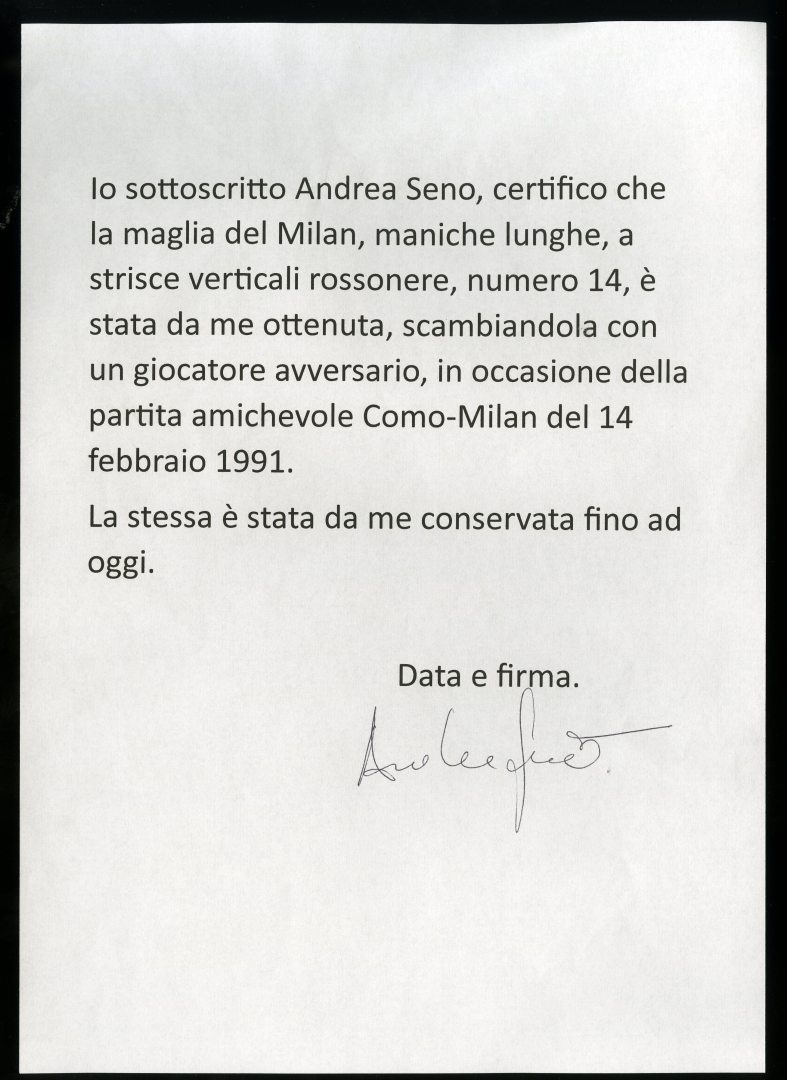 Jersey worn during the friendly match between Como and Milan (1-0) on 14 January 1991 at the Sinigaglia Stadium in Como and swapped at the end of the match with opponent Andrea Seno.