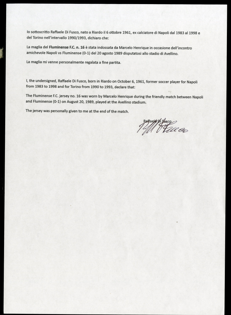 Jersey worn by Henrique during the friendly match between Napoli and Fluminense (0-1) on August 20, 1989, played at the Avellino stadium and exchanged at the end of the match with his opponent Raffaele Di Fusco.