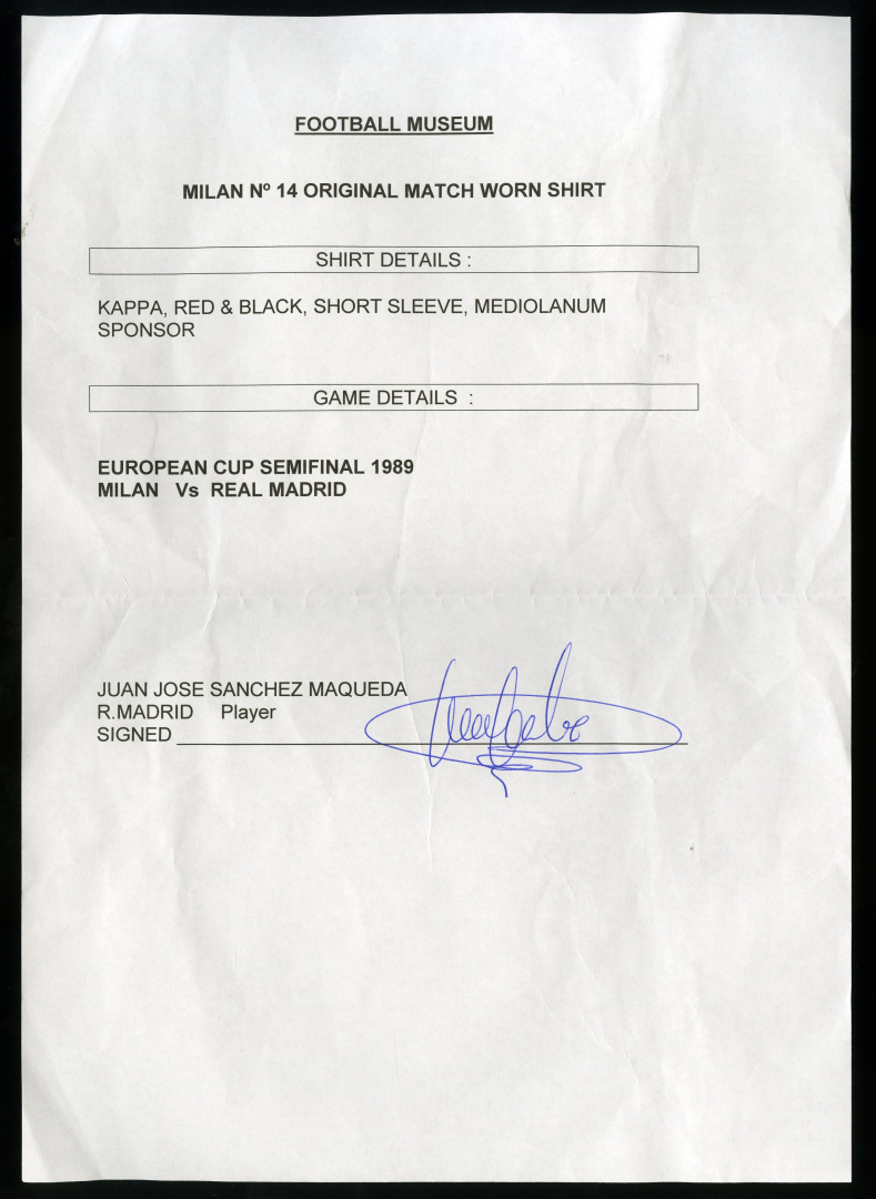 Jersey worn during the Champions Cup semi-final return leg between Milan and Real Madrid (5-0) on 19 April 1989 at the San Siro stadium in Milan and swapped at the end of the match with opponent Juan Jose Sanchez Maqueda.