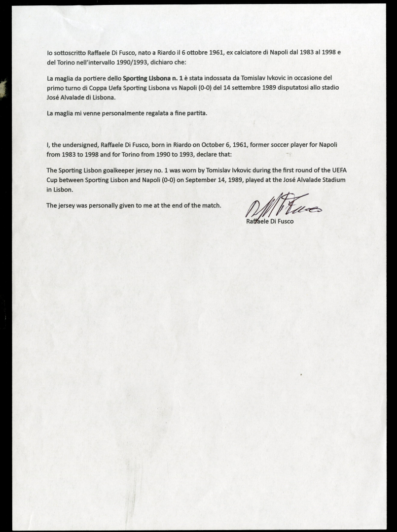 Jersey worn by Ivkovic during the first round of the UEFA Cup, Sporting Lisbon vs. Napoli (0-0) on September 14, 1989, played at the José Alvalade Stadium in Lisbon and exchanged at the end of the match with his opponent Raffaele Di Fusco.