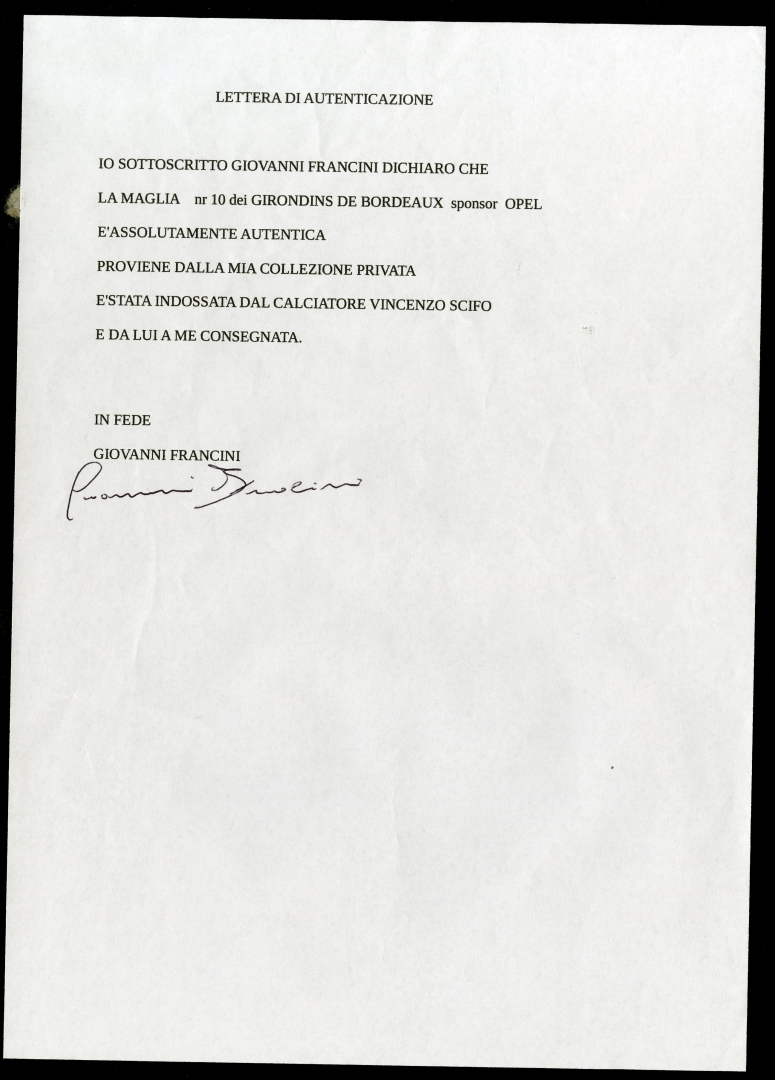 Jersey worn by Scifo during the third round of the UEFA Cup Bordeaux vs Napoli (0-1) on 23 November 1988, played at the Stade Chaban-Delmas in Bordeaux and swapped at the end of the match with his opponent Giovanni Francini. COA of origin attached.