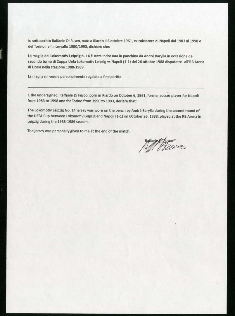 Jersey worn by Barylla in the first leg of the UEFA Cup round of 32 between Lokomotive Leipzig and Napoli (1-1) on October 26, 1988, played at the RB Arena in Leipzig and exchanged at the end of the match with his opponent Raffaele Di Fusco.