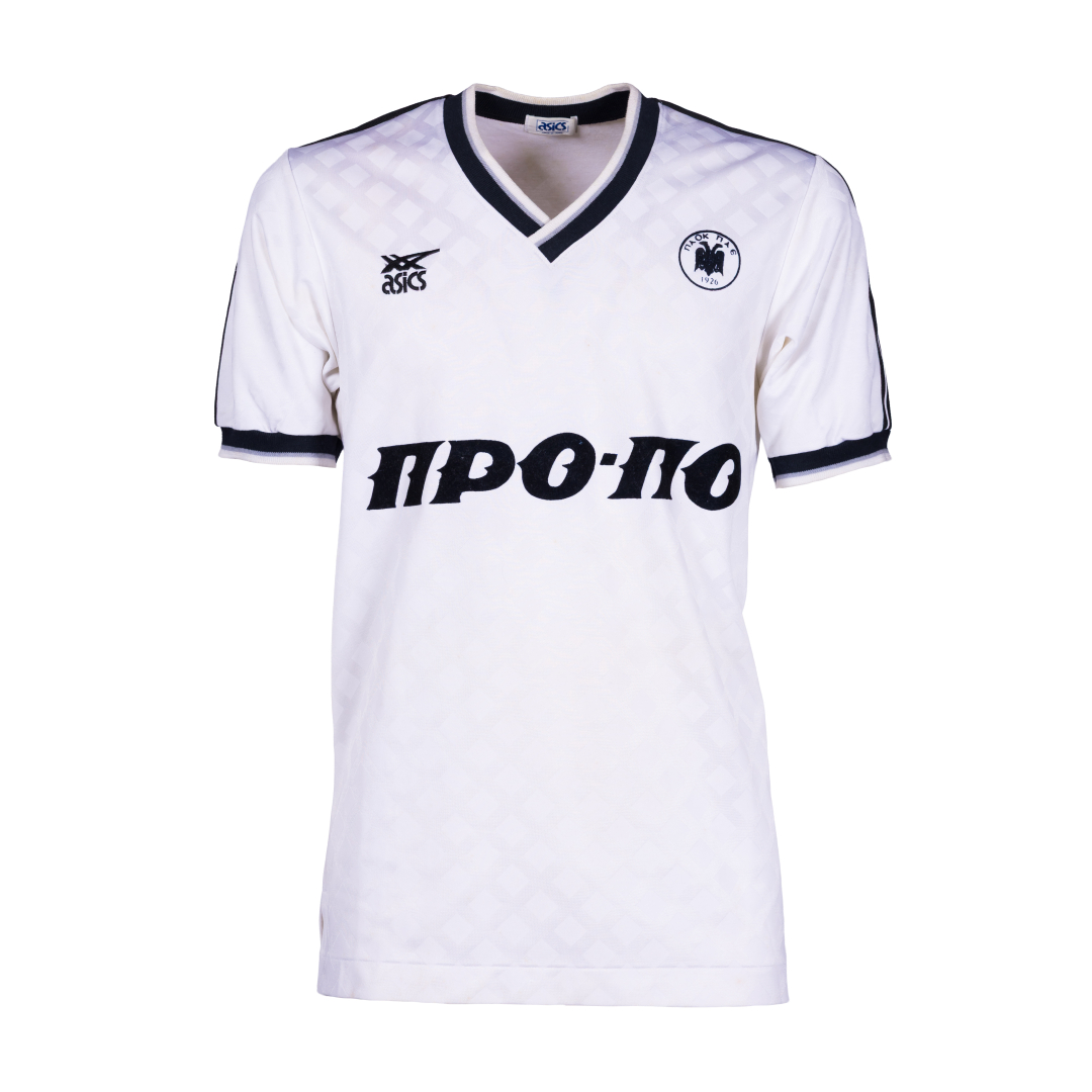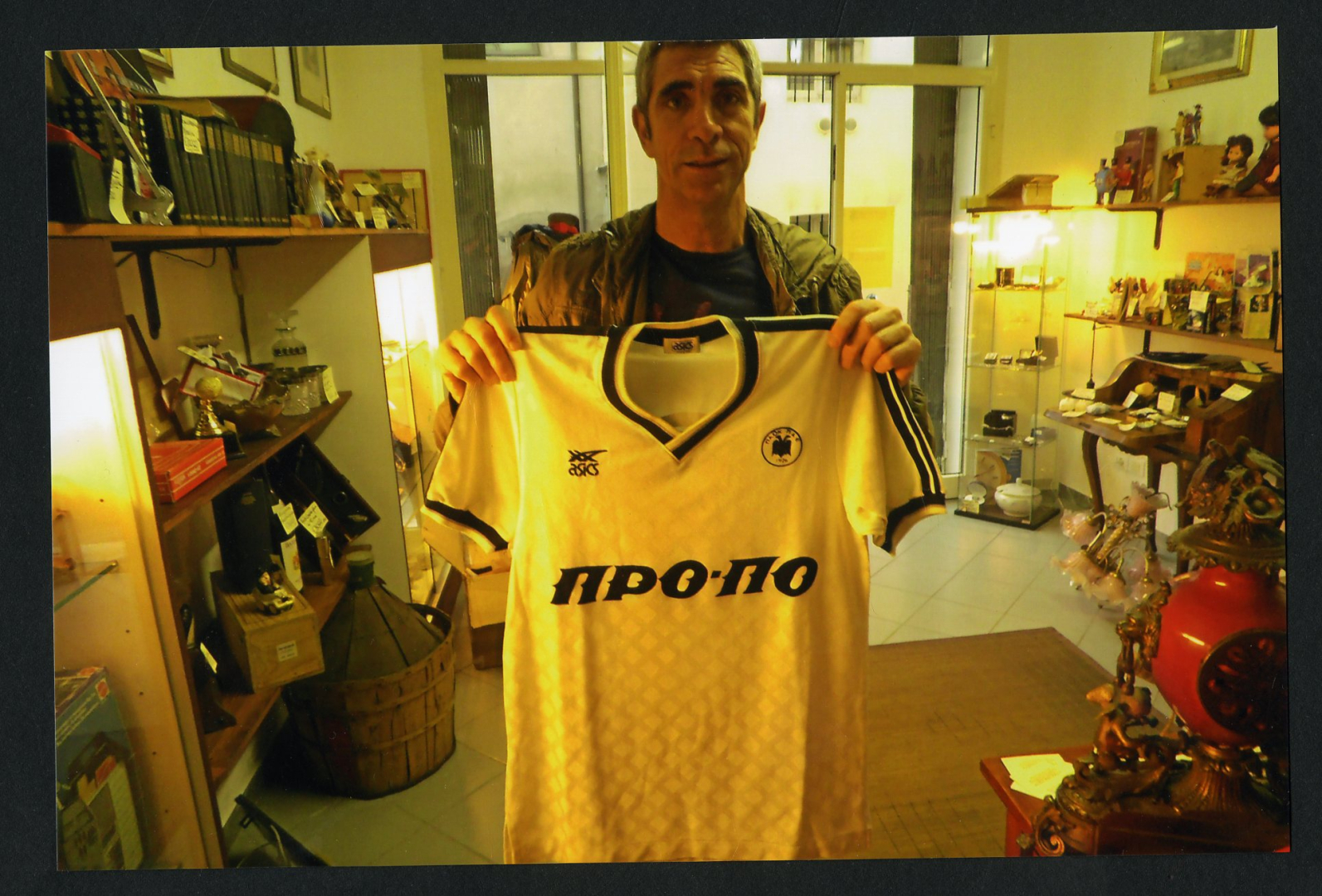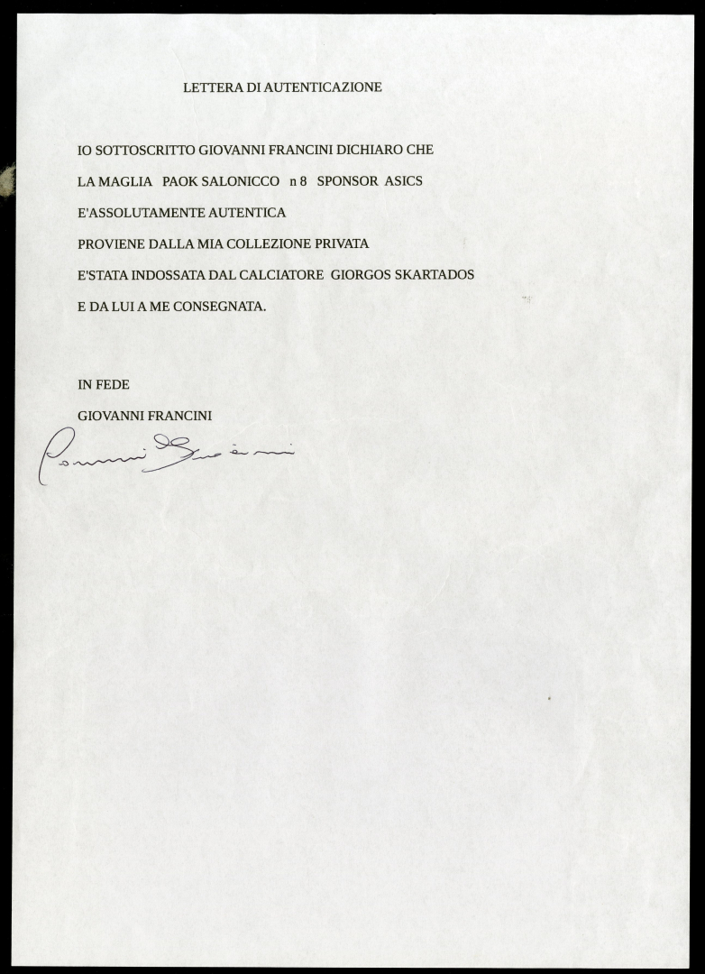 Jersey worn by Skartados during the first leg of the UEFA Cup Napoli vs Paok Thessaloniki (1-0) on 7 September 1988, played at the San Paolo Stadium in Naples and swapped at the end of the match with opponent Giovanni Francini. COA of origin attached. Clear signs of wear.