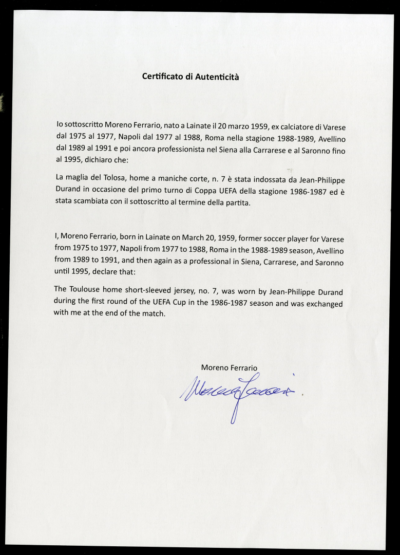 Jersey worn by Durand during the first round of the UEFA Cup, home or away, and swapped at the end of the match with his opponent Moreno Ferrario.