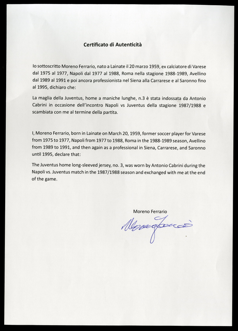 Jersey worn by Cabrini during the Napoli vs Juventus match (2-1) on 13 December 1987 at the Stadio San Paolo in Naples and exchanged at the end of the match with his opponent Moreno Ferrario.