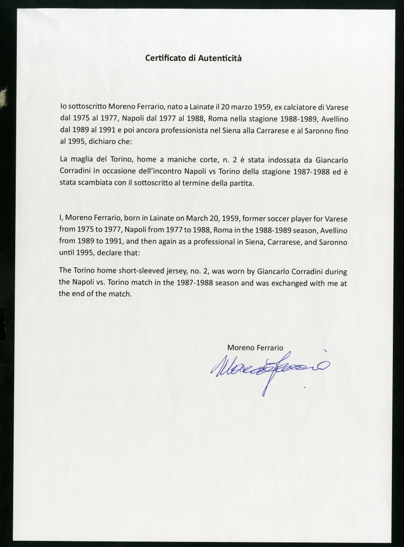 Jersey worn during the Napoli vs Torino match (3-1) on 22 November 1987 at the San Paolo stadium in Naples and swapped at the end of the match with opponent Moreno Ferrario.