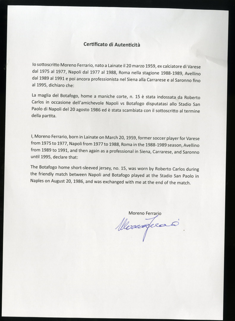 Jersey worn by Roberto Carlos during the friendly match between Napoli and Botafogo (1-0) on 20 August 1986 at the Stadio San Paolo in Naples, and swapped at the end of the match with his opponent, Moreno Ferrario.
