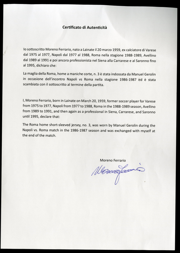 Jersey worn by Gerolin during the Napoli vs Roma match (0-0) on 15 March 1987 at the San Paolo stadium in Naples and swapped at the end of the match with opponent Moreno Ferrario.