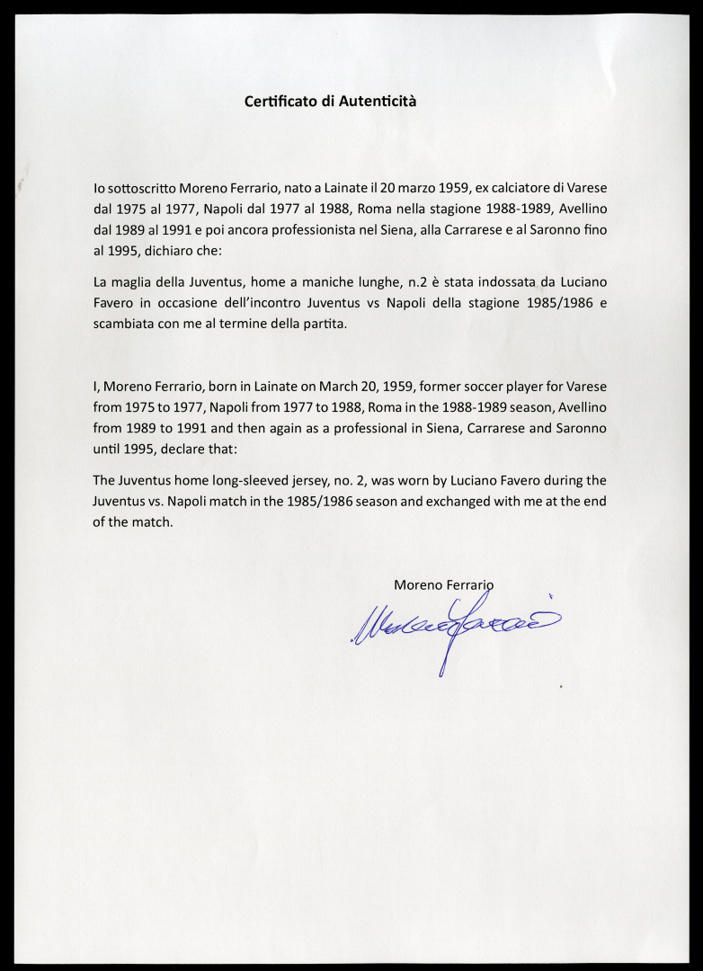 Jersey worn by Favero during the Juventus vs Napoli match (1-1) on 9 March 1986 at the Stadio Comunale in Turin and exchanged at the end of the match with his opponent Moreno Ferrario.