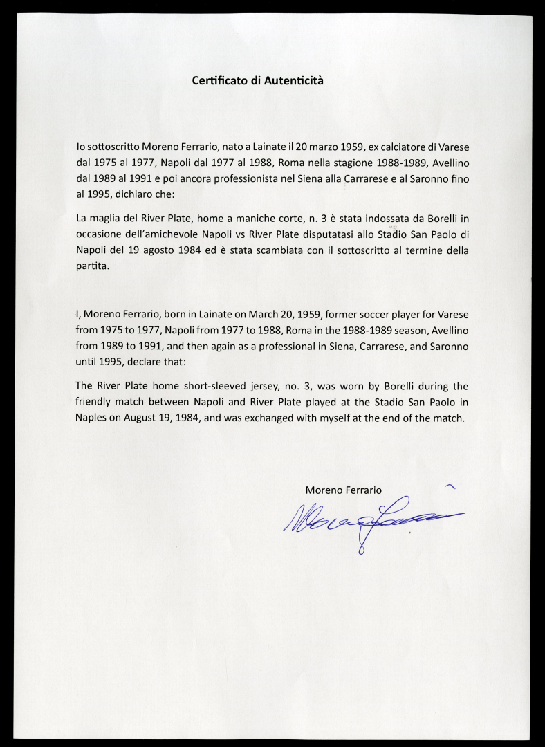 Jersey worn by Borrelli during the friendly match between Napoli and River Plate (0-0) on 19 August 1984 at the San Paolo stadium in Naples and exchanged at the end of the match with his opponent Moreno Ferrario.